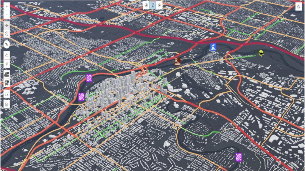 Building on this research, the team began developing a prototype urban digital twin for Calgary. We started with creating a functional proof of concept that could visualize and interact with real city data. The prototype integrates several of Calgary’s public datasets — including map data and live feeds such as public transit— into an interactive web application. The current version serves as a working foundation for more advanced features, including enhanced data integration, analytics, and simulations. This project is ongoing, with continued development of the prototype to expand its capabilities.